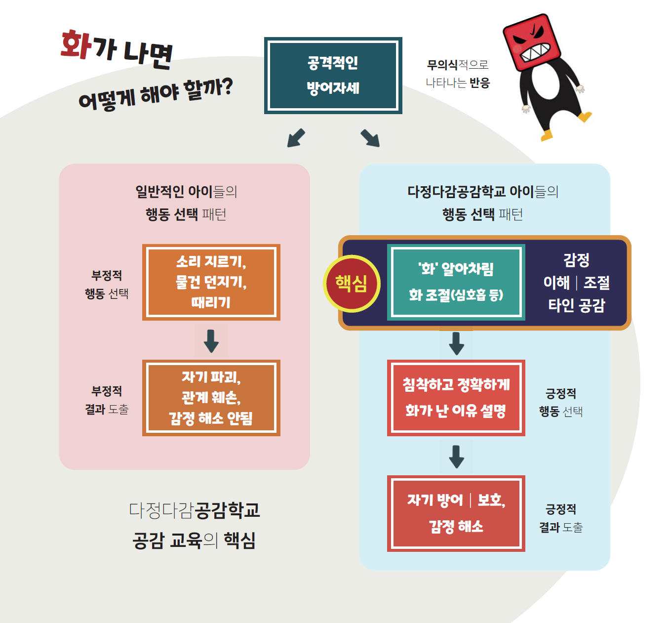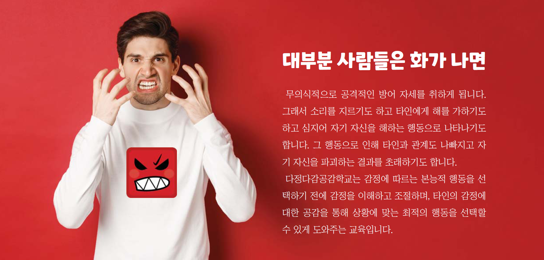 우리는 지금까지 배려, 나눔, 책임과 같은 보이는 행동에만 신경 쓰며 교육해왔습니다. 하지만, 행동을 하게 만드는 원인인 감정에 대해서는 숨기거나 억눌러 왔습니다.